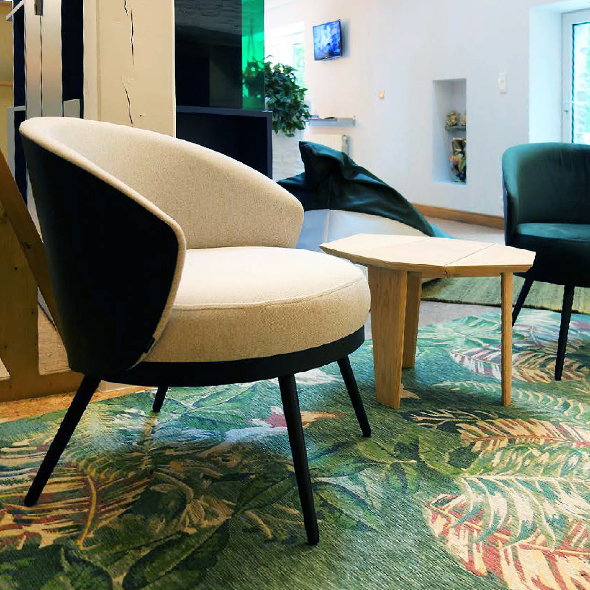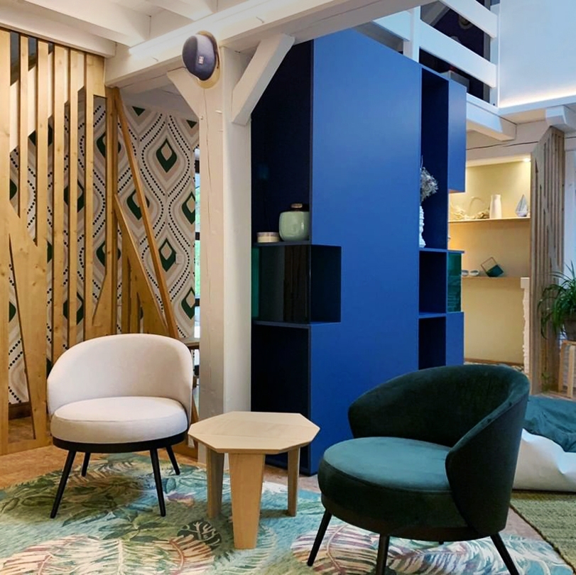 Anne-Sophie This de Déco-Nantes répond à la problématique suivante : « J’ai une pièce qui sert d’entrée, montrez-moi comment la rendre utile et originale ». La pièce a ainsi été découpée en plusieurs parties avec des séparations intelligentes et aérées. Un hall d’entrée est dessiné avec le bout de canapé SILEX. Un petit meuble qui peut être utilisé comme table d’appoint. Avec son design épuré, il met en avant le bois massif et s’intègre aussi bien dans un intérieur scandinave que japandi ou encore contemporain… Dans ce projet, il illumine la pièce et contraste avec le tapis à motifs.