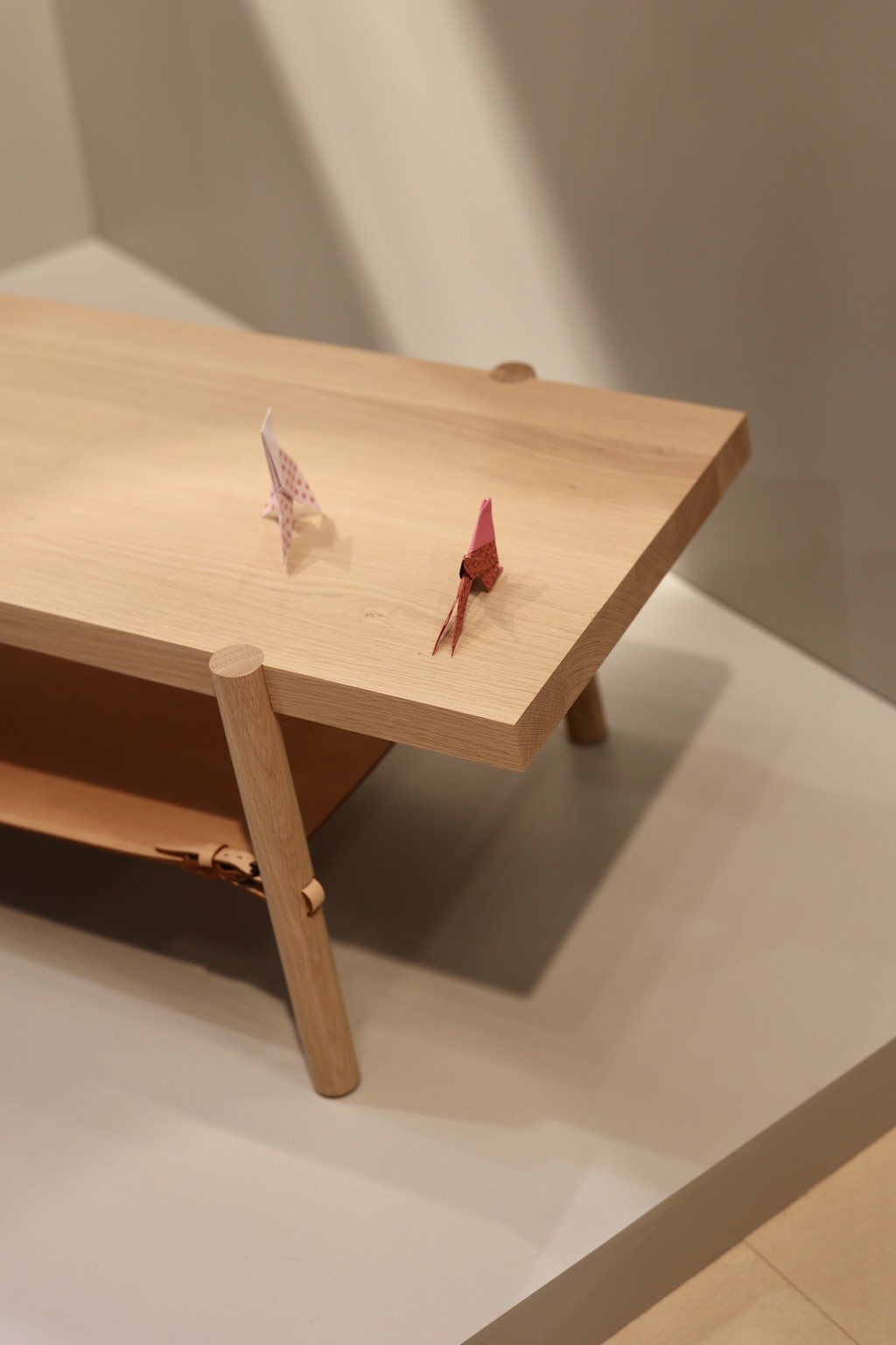C’est ensuite tout notre savoir-faire traditionnel qui s’exprime autour de ces deux pièces exceptionnelles. La première est une table basse issue de notre collaboration avec la marque de maroquinerie Bleu de Chauffe, mêlant habilement bois massif et cuir tanné végétal. Puis, nous avons imaginé une chaise dont l’assise et le dossier se forment à partir d’une unique pièce de bois. Une prouesse technique avec un travail de découpe minutieux et délicat qui met en avant la beauté de l’artisanat français.