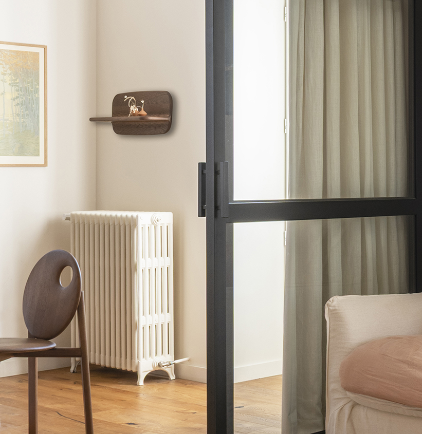 L’étagère TÉHÈME 60 en est la parfaite illustration : angles poncés à la main, courbes adoucies, c’est une étagère tout en rondeur qui habille votre mur.