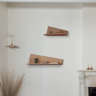 Aériennes, les étagères PLIAGE viennent se poser au mur avec légèreté. Placées en hauteur, la couleur personnalisable du dessous apparaît.