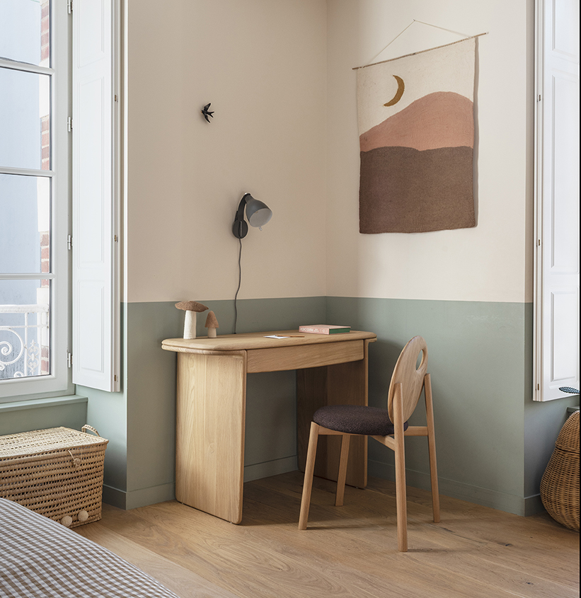 Proposée en version tout bois, elle est ici disponible avec une assise en tissu et déclinée en 3 coloris : Coral, Encircle et Zenith.