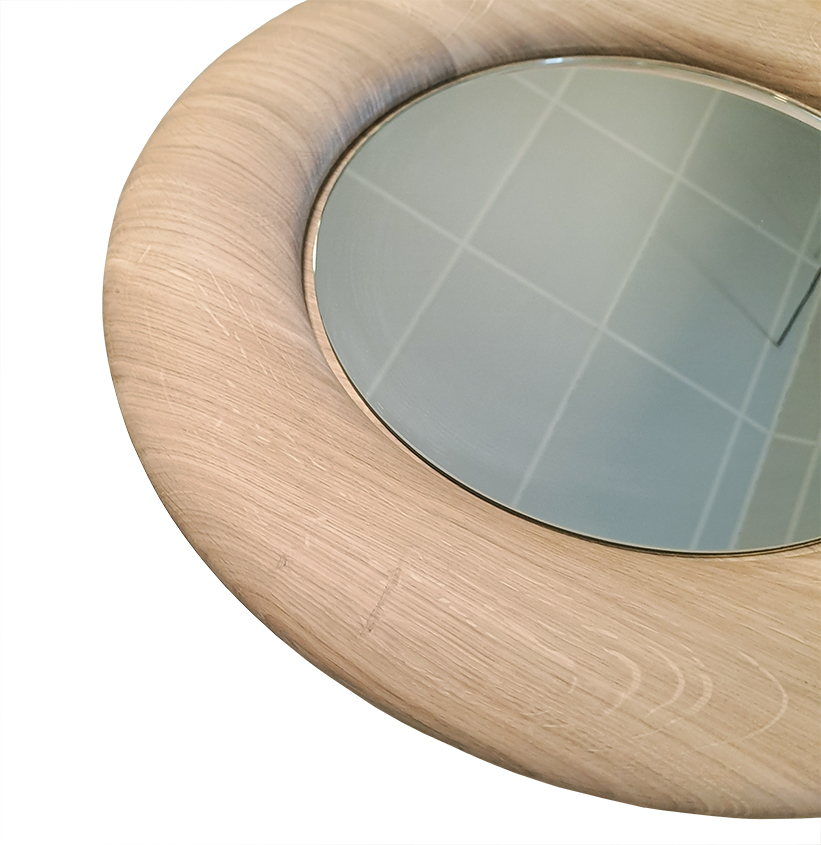 Travaillé dans une seule pièce de chêne massif, le miroir DONUT attire l’oeil par la générosité de ses formes.