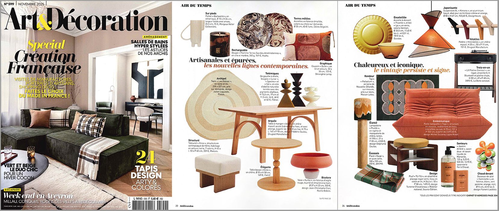 Retrouvez la table de repas ARCH et la patère HIRONDELLES dans le magazine Arts et Décoration de Novembre 2025
