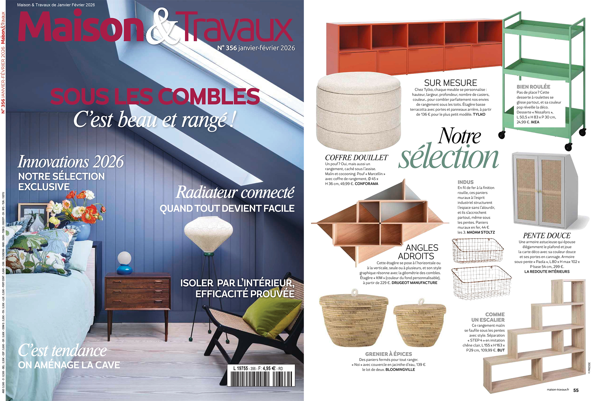 L’étagère modulable KIM dans le magazine Maison & Travaux, numéro de janvier-février 2026. Une solution de rangement murale pratique pour optimiser votre intérieur. La création KIM se pose à l’horizontale ou à la verticale, seule ou à plusieurs… En chêne massif, la couleur de son fond est personnalisable.
